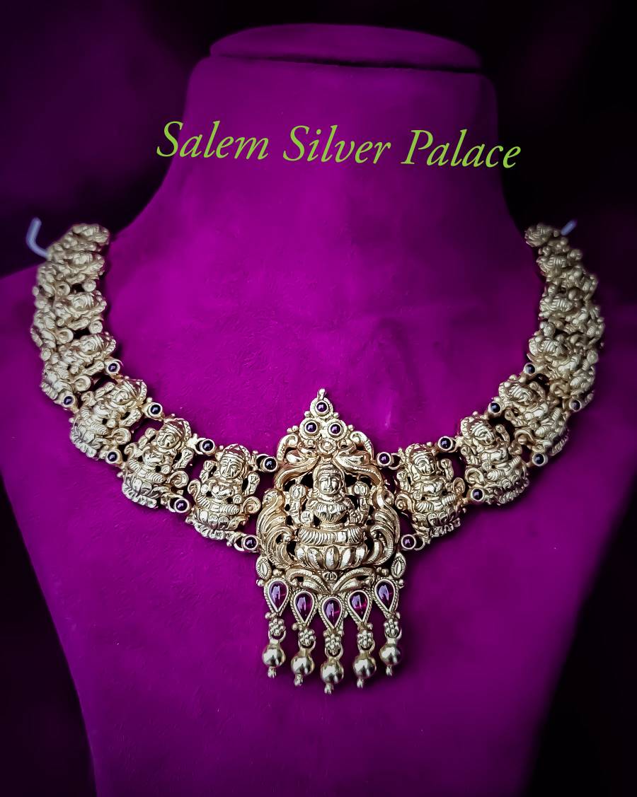 Silver Necklace for Women Gold Plated Silver Jewellery with Red and Green Kempu stones Available 92.5 Silver Standards Heavy Patterns Recommended for Party wear and Bridal Wear Salem Silver Palace is the best trusted Online Store and Physical Store to buy All Types Of Silver Articles, Silver Ornaments and Silver Jewellery at Silver Wholesale Prices. Safe Shipping Facilities Are Available All Over The Country. Join our Silver Savings Schemes and get Maximum benefits for your precious Savings. Download our app at Google play store to know Daily Silver Rates https://play.google.com/store/apps/details?id=com.foxthree.salemsilverpalace For More Information Visit Our Website www.salemsilverpalace.in For Orders Contact Salem Silver Palace Silver Wholesale Jewellery Shop In Salem Shevapet Salem 636002 Tamil Nadu India 9894353579 6382456939